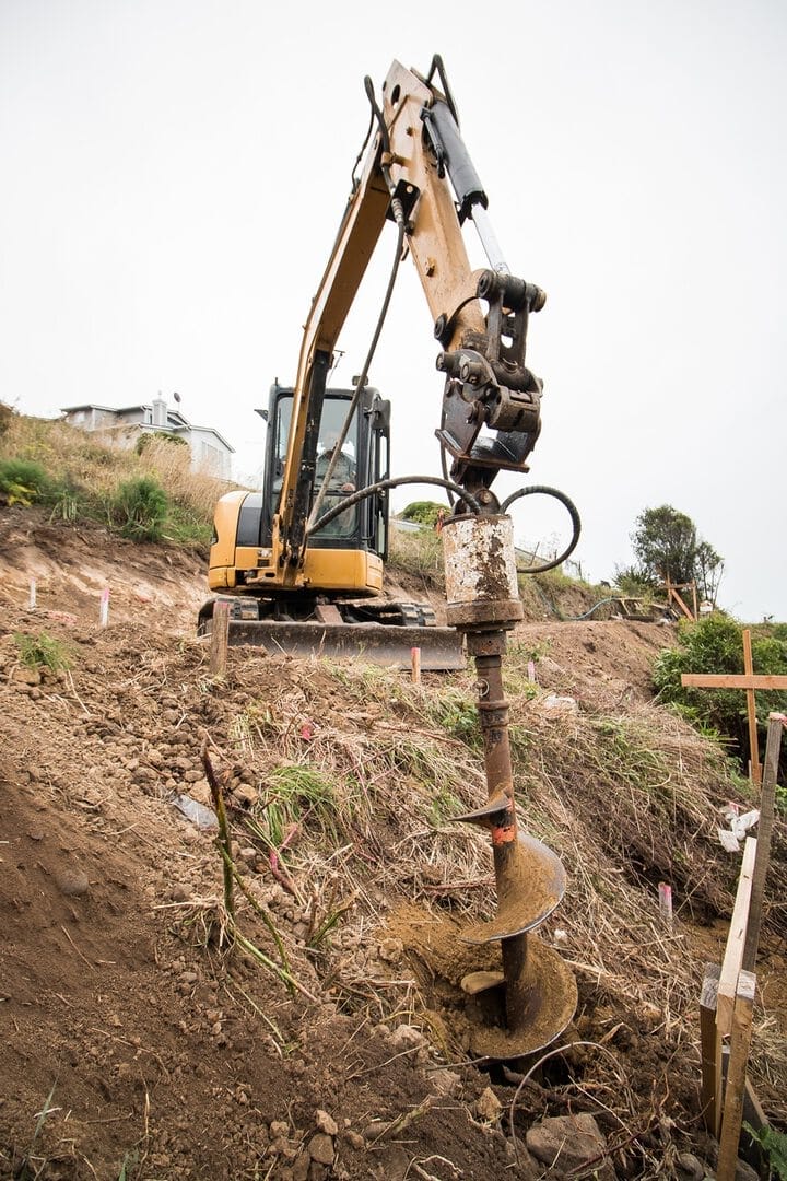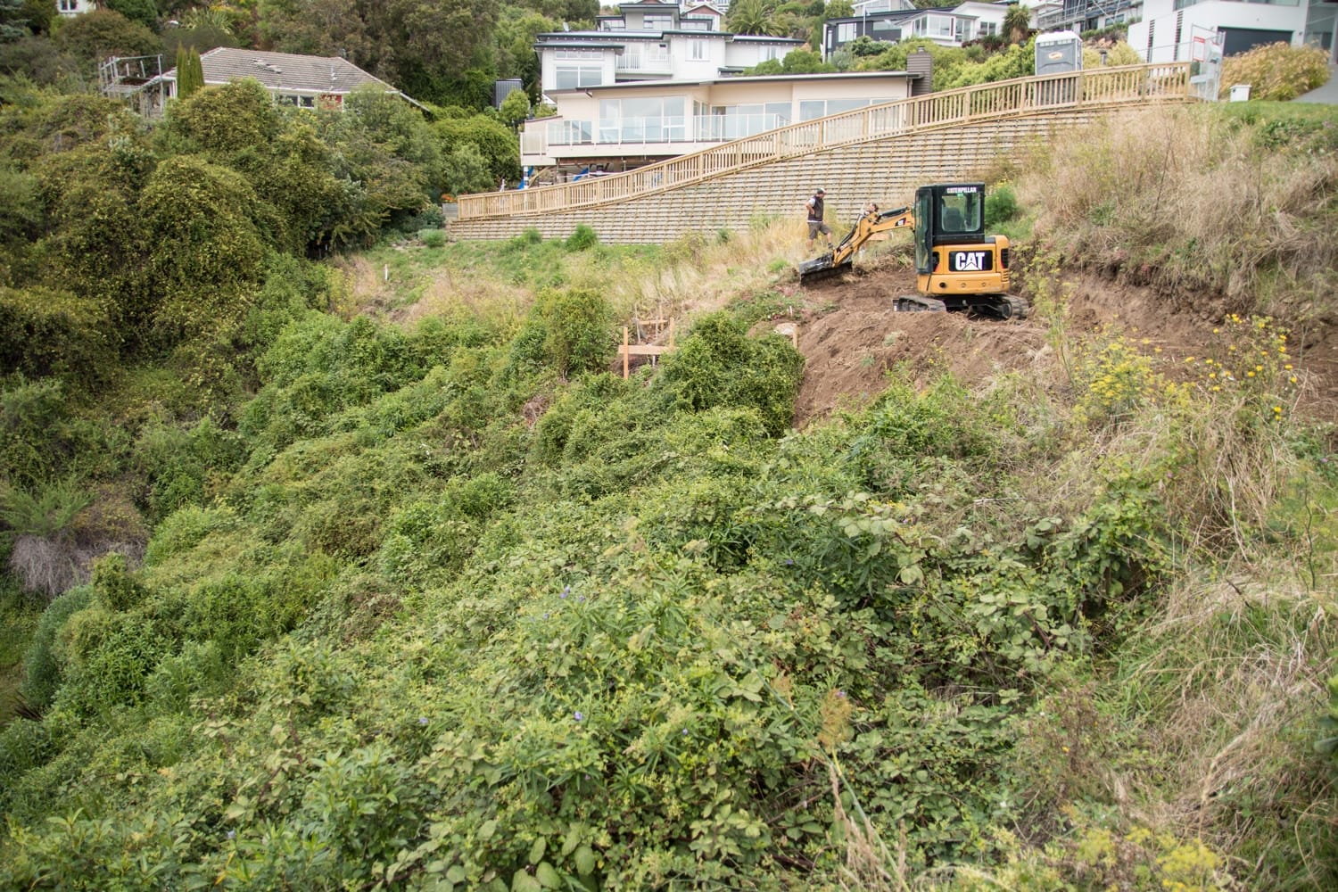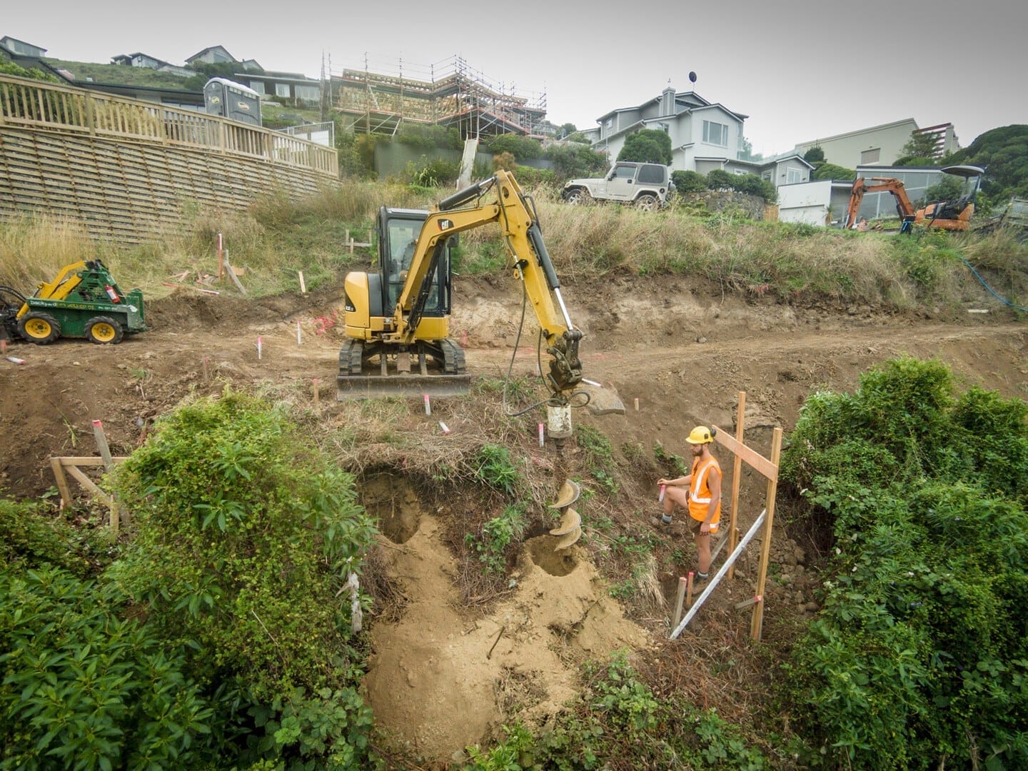 This was a bare, over-grown section on a steep hillside with no access-way in place. Before site-leveling and drilling could commence, a temporary driveway needed to be carefully excavated along the hillside. The video shows excavation of the hillside and drilling holes for the piles.