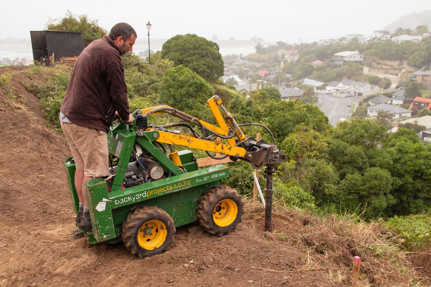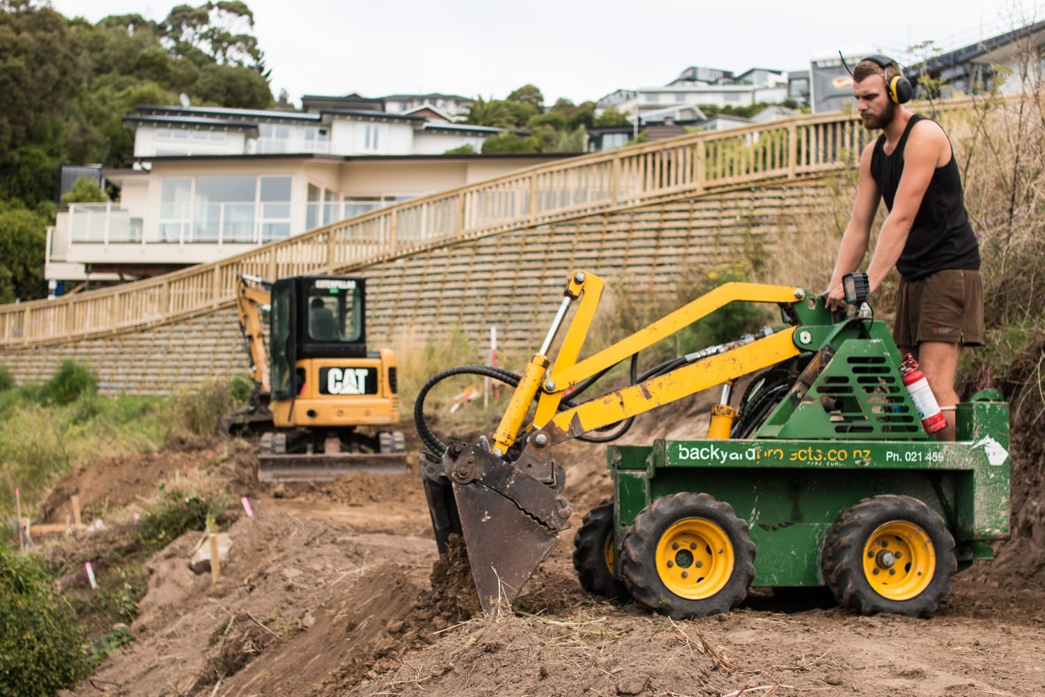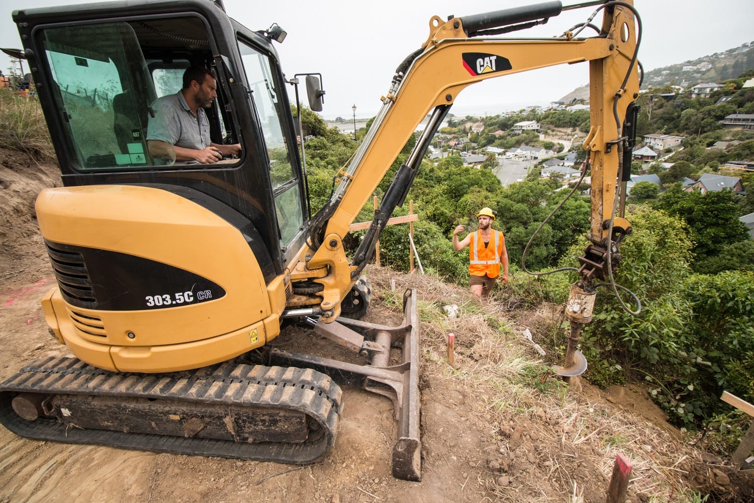 This was a bare, over-grown section on a steep hillside with no access-way in place. Before site-leveling and drilling could commence, a temporary driveway needed to be carefully excavated along the hillside. The video shows excavation of the hillside and drilling holes for the piles.